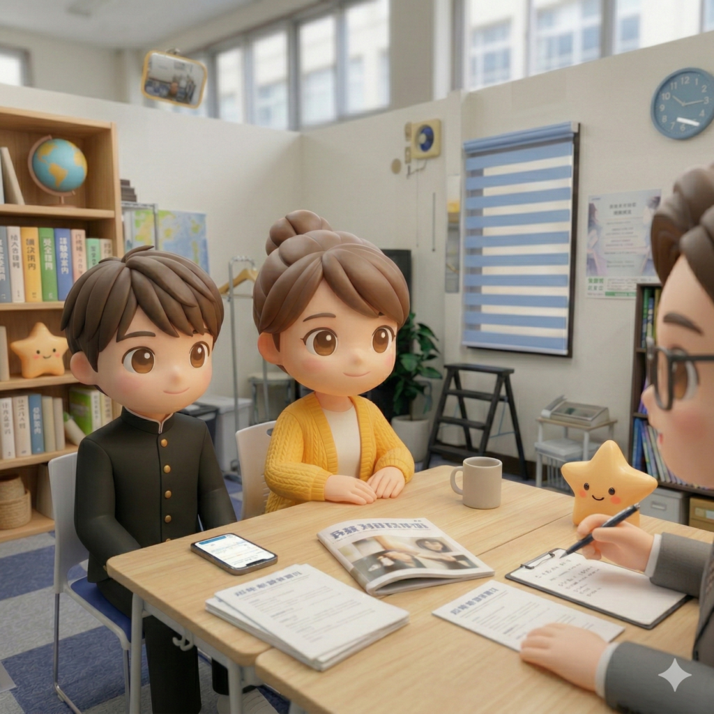 お子様と一緒に教室へお越しください(オンラインも可)。 これまでのテスト結果やノートをお持ちいただければ、塾長がその場で**「なぜ今の成績で止まっているのか」「どこでつまずいているのか」**をプロの視点で分析します。これだけで「やるべきこと」が見えてスッキリされる保護者様も多いです。