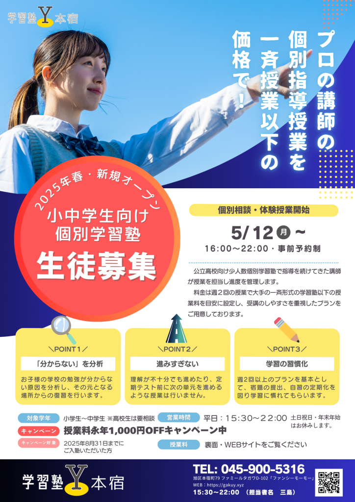 こんにちは。本宿中、左近山中、万騎が原中などが最寄りとなっております、本宿町の学習塾 Yです。