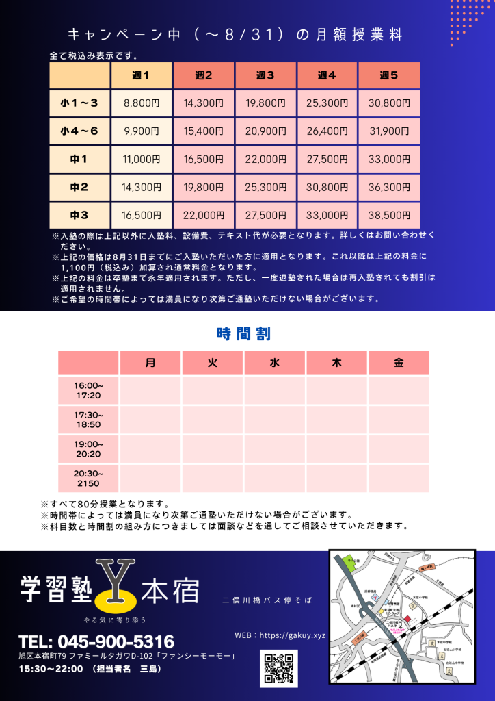 裏面は8月31日までのキャンペーン限定の料金表になっておりますので通塾される際のご参考にしていただければと思います。