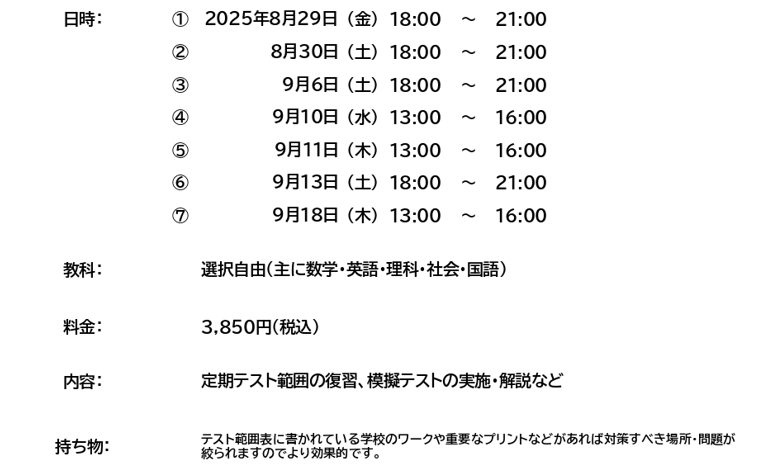 今回は定期テスト対策授業についてのお知らせです。当塾の周辺の対象校である本宿中学校、万騎が原中学校、左近山中学校では9月中に定期テストが実施されます。これに際して当塾では定期テスト対策授業を行います。
