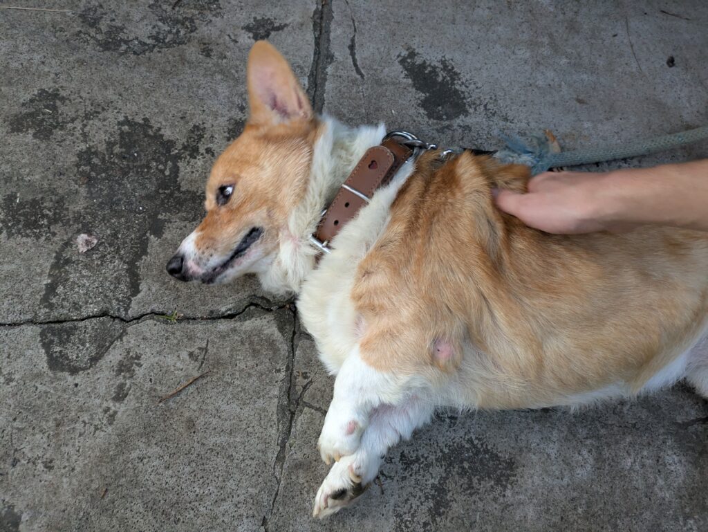 駄菓子店モーモー営業日にお手伝いをしていましたが、仕事終わりにオーナー様の愛犬ラッキーくんが横になって甘えてきてくれたので、モフったときの画像です。